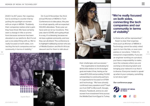The organisation is fundraising for $ 100,000 dollars to hit its budget goal and make it free , having so far raised $ 75,000 and providing 75,000 scholarships to community partners in organisations focused on STEM and technology . “ We have already confirmed many speakers and IT leaders from SAP to Microsoft , Google , Amazon , Facebook , and so on , and women from investment firms across the Middle East from Egypt to Turkey to Dubai who will be represented .” Nasiri is clear that organisations such as Women of MENA in Technology cannot be solely relied upon to turn the tide , or even companies or recruiters . “ I think it ’ s everyone ’ s responsibility . If you are an engineer working on a product , you have a responsibility to make sure the company where you are working is introducing talent and bringing your network in so that it is diverse . Everyone needs to speak up when in your company , something is not done right .”