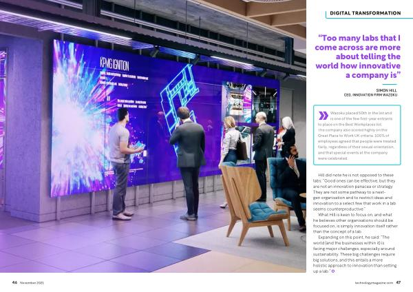 Expanding on this point , he said : “ The world ( and the businesses within it ) is facing major challenges , especially around sustainability . These big challenges require big solutions , and this entails a more holistic approach to innovation than setting up a lab .” technologymagazine . com 47