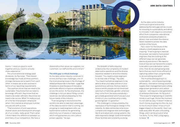 This multifaceted approach to sustainability – encompassing energy efficiency , innovative cooling solutions , supply chain management and cuttingedge power generation and carbon capture – will require a new generation of skilled professionals . As Pip puts it : “ The scope for engineering or scientific minds is just huge . And at the moment it ’ s not seen as sexy . It doesn ’ t make as much money as going into the city , but to me it ’ s much sexier . It has a much bigger impact on the world . I feel I can walk away after 45 years of building things , and I can be proud of what I ’ ve done . To me , that ’ s a big legacy to leave .” technologymagazine . com 127