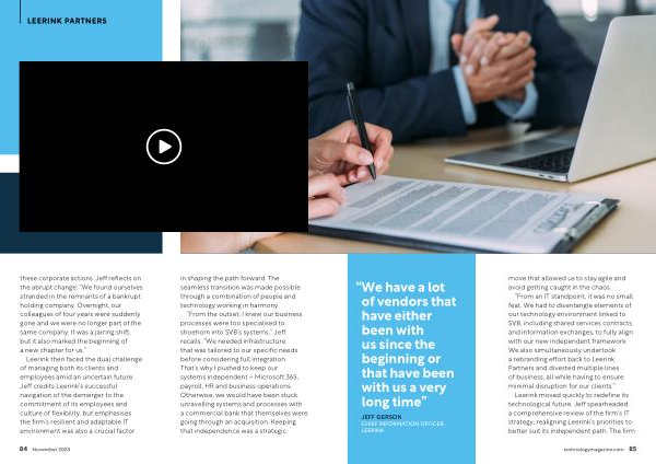 Leerink then faced the dual challenge of managing both its clients and employees amid an uncertain future . Jeff credits Leerink ’ s successful navigation of the demerger to the commitment of its employees and culture of flexibility , but emphasises the firm ’ s resilient and adaptable IT environment was also a crucial factor in shaping the path forward . The seamless transition was made possible through a combination of people and technology working in harmony .