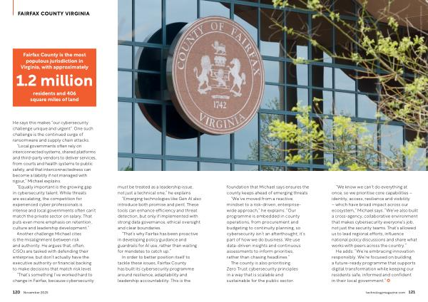 “ We’ ve moved from a reactive mindset to a risk-driven, enterprisewide approach,” he explains.“ Our programme is embedded in county operations, from procurement and budgeting to continuity planning, so cybersecurity isn’ t an afterthought; it’ s part of how we do business. We use data-driven insights and continuous assessments to inform priorities, rather than chasing headlines.”