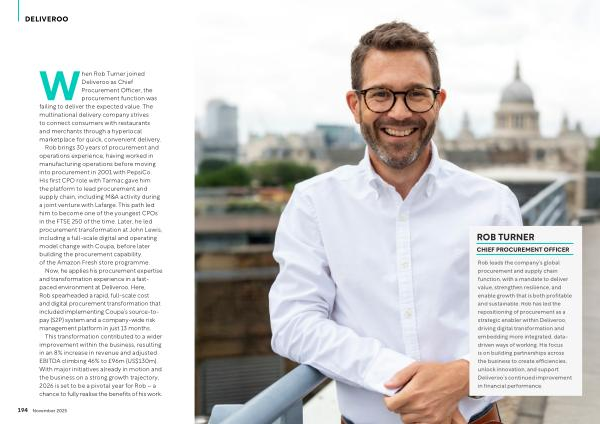 Now, he applies his procurement expertise and transformation experience in a fastpaced environment at Deliveroo. Here, Rob spearheaded a rapid, full-scale cost and digital procurement transformation that included implementing Coupa’ s source-topay( S2P) system and a company-wide risk management platform in just 13 months.