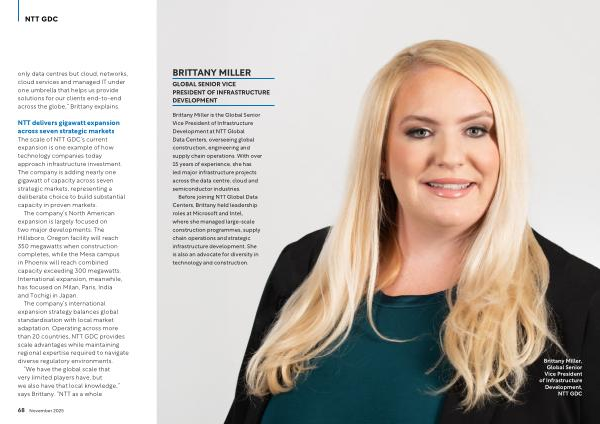 Before joining NTT Global Data Centers, Brittany held leadership roles at Microsoft and Intel, where she managed large-scale construction programmes, supply chain operations and strategic infrastructure development. She is also an advocate for diversity in technology and construction.