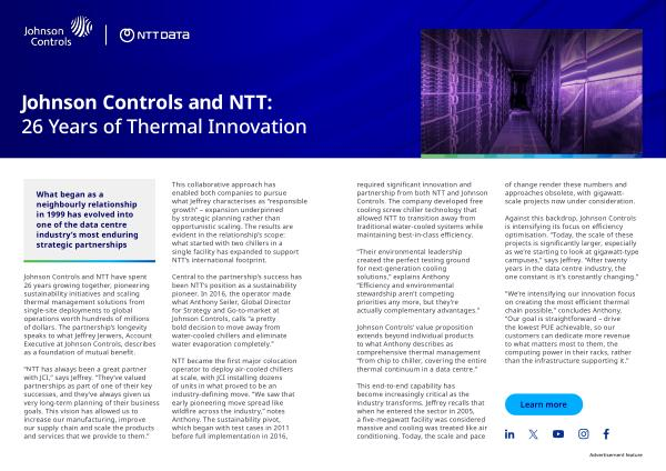 required significant innovation and partnership from both NTT and Johnson Controls. The company developed free cooling screw chiller technology that allowed NTT to transition away from traditional water-cooled systems while maintaining best-in-class efficiency.
