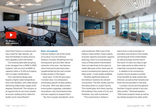 Data stronghold Infomart Ashburn sits at the center of Loudoun County ’ s famous Ashburn Corridor , benefiting from the strong power grid and fiber-dense networks in the area - key features which have led to ( and have been supplemented by ) the vast number of data centers in the region .