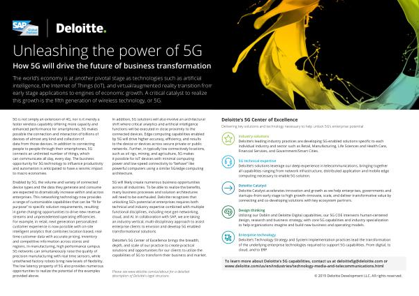 5G will likely create numerous business opportunities across all industries . To be able to realize the benefits , many business processes and solution architectures will need to be overhauled . Deloitte recognizes that unlocking 5G ’ s potential at enterprises requires both technical and industry expertise combined with multiple functional disciplines , including next gen networking , cloud , and AI . In collaboration with SAP , we are taking an industry vertical , multi-disciplinary approach to assist enterprise clients to envision and develop 5G enabled transformational solutions .