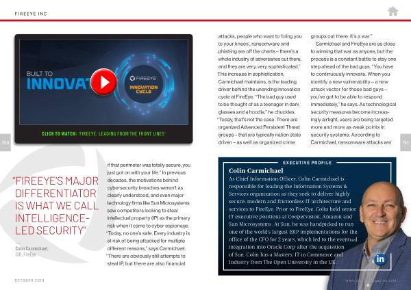 attacks , people who want to ‘ bring you to your knees ’, ransomware and phishing are off the charts – there ’ s a whole industry of adversaries out there , and they are very , very sophisticated .” This increase in sophistication , Carmichael maintains , is the leading driver behind the unending innovation cycle at FireEye . “ The bad guy used to be thought of as a teenager in dark glasses and a hoodie ,” he chuckles . “ Today , that ’ s not the case . There are organized Advanced Persistent Threat groups – that are typically nation state driven – as well as organized crime groups out there . It ’ s a war .”