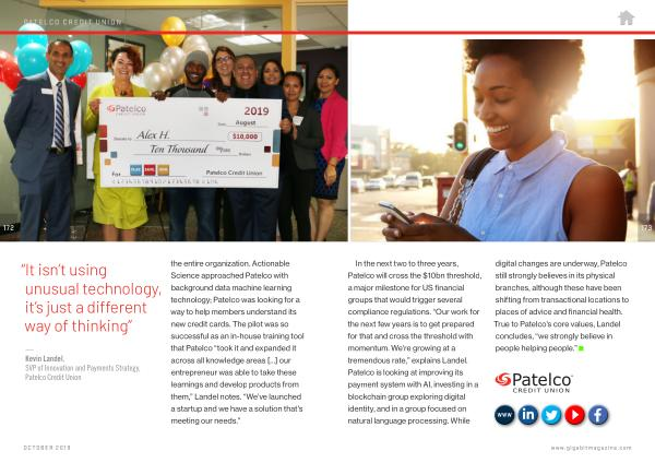 — Kevin Landel , SVP of Innovation and Payments Strategy , Patelco Credit Union the entire organization . Actionable Science approached Patelco with background data machine learning technology ; Patelco was looking for a way to help members understand its new credit cards . The pilot was so successful as an in-house training tool that Patelco “ took it and expanded it across all knowledge areas […] our entrepreneur was able to take these learnings and develop products from them ,” Landel notes . “ We ’ ve launched a startup and we have a solution that ’ s meeting our needs .”