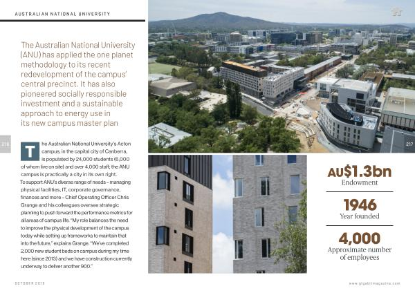 T he Australian National University ’ s Acton campus , in the capital city of Canberra , is populated by 24,000 students ( 6,000 of whom live on site ) and over 4,000 staff ; the ANU campus is practically a city in its own right . To support ANU ’ s diverse range of needs – managing physical facilities , IT , corporate governance , finances and more – Chief Operating Officer Chris Grange and his colleagues oversee strategic planning to push forward the performance metrics for all areas of campus life . “ My role balances the need to improve the physical development of the campus today while setting up frameworks to maintain that into the future ,” explains Grange . “ We ’ ve completed 2,000 new student beds on campus during my time here ( since 2013 ) and we have construction currently underway to deliver another 900 .”