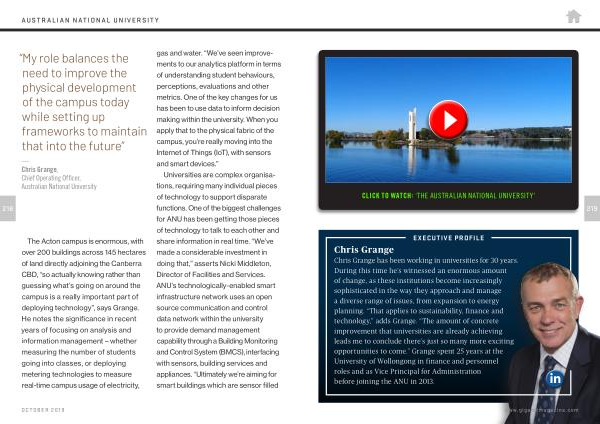 The Acton campus is enormous , with over 200 buildings across 145 hectares of land directly adjoining the Canberra CBD , “ so actually knowing rather than guessing what ’ s going on around the campus is a really important part of deploying technology ”, says Grange . He notes the significance in recent years of focusing on analysis and information management – whether measuring the number of students going into classes , or deploying metering technologies to measure real-time campus usage of electricity , gas and water . “ We ’ ve seen improvements to our analytics platform in terms of understanding student behaviours , perceptions , evaluations and other metrics . One of the key changes for us has been to use data to inform decision making within the university . When you apply that to the physical fabric of the campus , you ’ re really moving into the Internet of Things ( IoT ), with sensors and smart devices .”