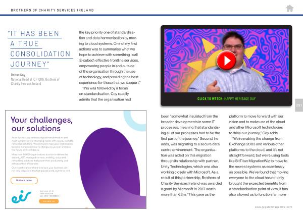 CLICK TO WATCH : HAPPY HERITAGE DAY 291 been “ somewhat insulated from the broader developments in some IT processes , meaning that standardising all of our processes had to be the first part of the journey .” Second , he adds , was migrating to a secure data centre environment . The organisation was aided on this migration through its relationship with partner , Unity Technologies , which was also working closely with Microsoft . As a result of this partnership , Brothers of Charity Services Ireland was awarded a grant by Microsoft in 2017 worth more than € 3m . “ This gave us the