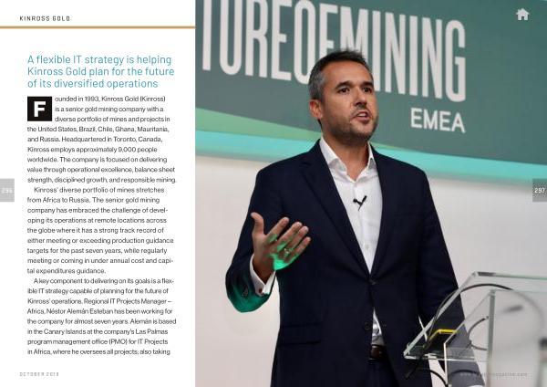 A key component to delivering on its goals is a flexible IT strategy capable of planning for the future of Kinross ’ operations . Regional IT Projects Manager – Africa , Néstor Alemán Esteban has been working for the company for almost seven years . Alemán is based in the Canary Islands at the company ’ s Las Palmas program management office ( PMO ) for IT Projects in Africa , where he oversees all projects ; also taking
