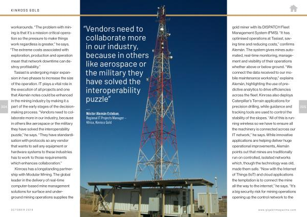Tasiast is undergoing major expansion in two phases to increase the size of the operation . IT plays a vital role in the execution of all projects and one that Alemán notes could be enhanced in the mining industry by making it a part of the early stages of the decisionmaking process . “ Vendors need to collaborate more in our industry , because in others like aerospace or the military they have solved the interoperability puzzle ,” he says . “ They have standardisation with protocols so any vendor that wants to sell any equipment or hardware systems to these industries has to work to those requirements which enhances collaboration .”