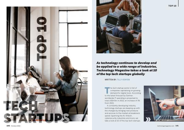 A constantly developing industry , technology startups are keeping up with the changes by bringing new products and services to the market at breakneck speed . Spanning the AI , fintech , cybersecurity industries and more , we take a look at 10 of the top tech startups . technologymagazine . com 141