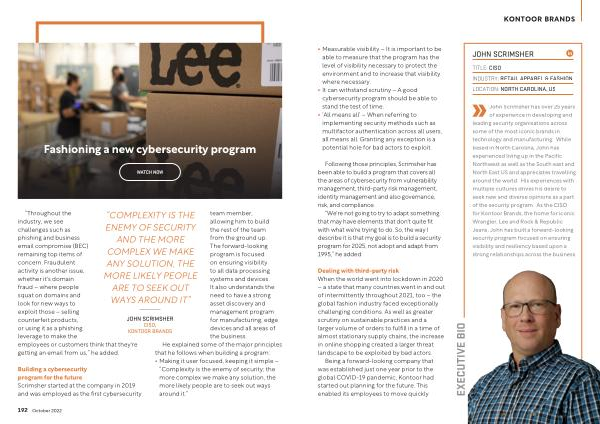 John Scrimsher has over 25 years of experience in developing and leading security organisations across some of the most iconic brands in technology and manufacturing . While based in North Carolina , John has experienced living up in the Pacific Northwest as well as the South east and North East US and appreciates travelling around the world . His experiences with multiple cultures drives his desire to seek new and diverse opinions as a part of the security program . As the CISO for Kontoor Brands , the home for iconic Wrangler , Lee and Rock & Republic Jeans , John has built a forward-looking security program focused on ensuring visibility and resiliency based upon a strong relationships across the business .