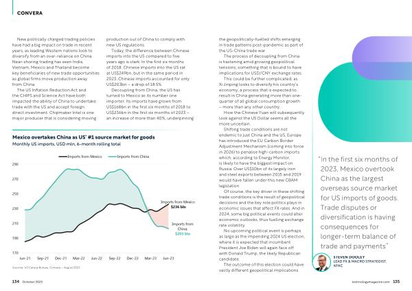 Decoupling from China , the US has turned to Mexico as its number one importer . Its imports have grown from US $ 168bn in the first six months of 2018 to US $ 236bn in the first six months of 2023 – an increase of more than 40 %, underpinning