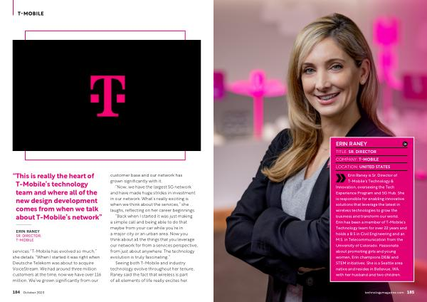 T-Mobile ’ s Technology & Innovation , overseeing the Tech Experience Program and 5G Hub . She is responsible for enabling innovative solutions that leverage the latest in wireless technologies to grow the business and transform our world . Erin has been a member of T-Mobile ’ s Technology team for over 22 years and holds a B . S in Civil Engineering and an M . S . in Telecommunication from the University of Colorado . Passionate about promoting girls and young women , Erin champions DE & I and STEM initiatives . She is a Seattle area native and resides in Bellevue , WA , with her husband and two children .