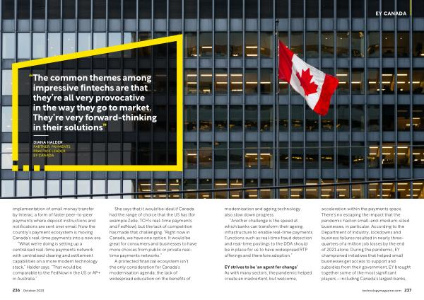 EY strives to be ‘ an agent for change ’ As with many sectors , the pandemic helped create an inadvertent , but welcome , acceleration within the payments space . There ’ s no escaping the impact that the pandemic had on small-and-medium-sized businesses , in particular . According to the Department of Industry , lockdowns and business failures resulted in nearly threequarters of a million job losses by the end of 2021 alone . During the pandemic , EY championed initiatives that helped small businesses get access to support and subsidies from their government . EY brought together some of the most significant players – including Canada ’ s largest banks ,