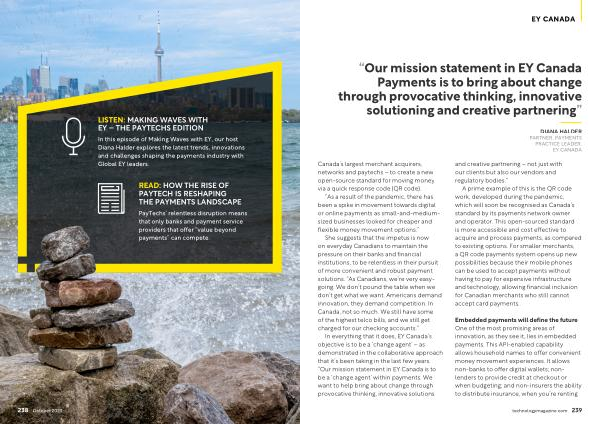 In everything that it does , EY Canada ’ s objective is to be a ‘ change agent ’ – as demonstrated in the collaborative approach that it ’ s been taking in the last few years . “ Our mission statement in EY Canada is to be a ‘ change agent ’ within payments . We want to help bring about change through provocative thinking , innovative solutions and creative partnering – not just with our clients but also our vendors and regulatory bodies .”