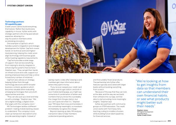 One example is CapTech, which handles systems integration and strategic development for VyStar. CapTech covers hands-on technical work and higherlevel planning, helping the credit union align technology with business goals while meeting regulatory requirements.