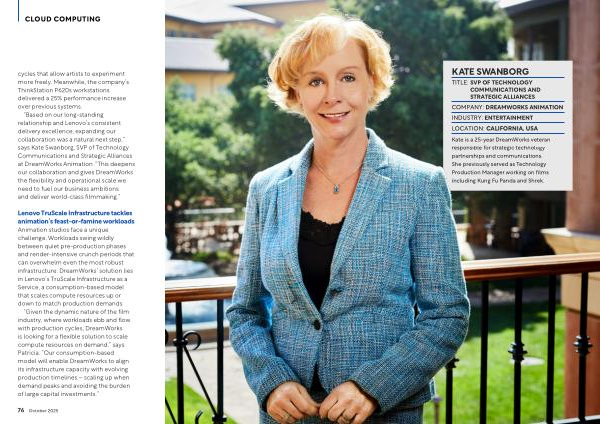 “ Based on our long-standing relationship and Lenovo’ s consistent delivery excellence, expanding our collaboration was a natural next step,” says Kate Swanborg, SVP of Technology Communications and Strategic Alliances at DreamWorks Animation.“ This deepens our collaboration and gives DreamWorks the flexibility and operational scale we need to fuel our business ambitions and deliver world-class filmmaking.”