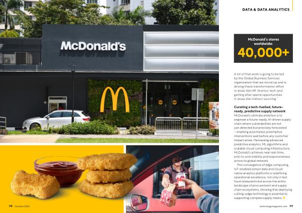 Curating a tech-fuelled, futureready, predictive supply network McDonald’ s ultimate ambition is to engineer a future-ready, AI-driven supply chain where vulnerabilities are not just detected but precisely forecasted – enabling automated, preemptive interventions well before any customer impact arises. Harnessing advanced predictive analytics, ML algorithms and scalable cloud computing infrastructure, McDonald’ s achieves near real-time, end-to-end visibility and responsiveness across its global network.