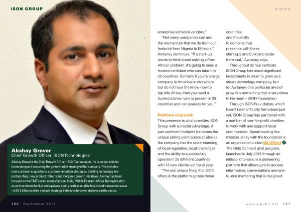 Akshay Grover is the Chief Growth Officer , iSON Technologies . He is responsible for formulating and executing the go-to-market strategy of the company . This includes new customer acquisitions , customer retention strategies , building technology-led partnerships , new product roll outs and inorganic growth initiatives . Akshay has been focused on the TMT sector across Europe , India , Middle East and Africa . During his stint as an investment banker and a private equity professional he has closed transactions over ~ USD 5 billion and led multiple strategic initiatives for several players in the sector .
