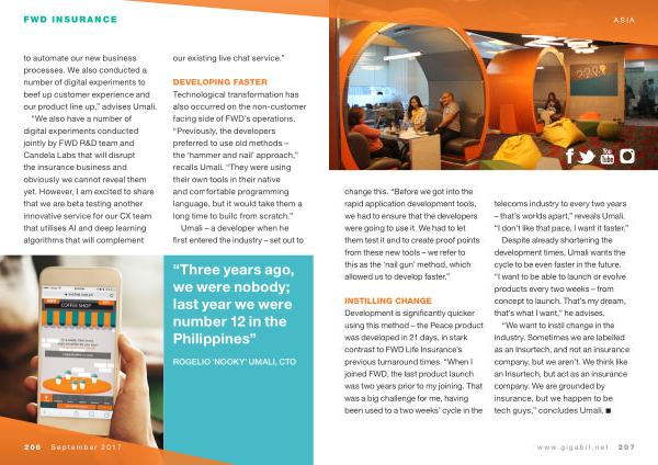 INSTILLING CHANGE Development is significantly quicker using this method – the Peace product was developed in 21 days , in stark contrast to FWD Life Insurance ’ s previous turnaround times . “ When I joined FWD , the last product launch was two years prior to my joining . That was a big challenge for me , having been used to a two weeks ’ cycle in the telecoms industry to every two years – that ’ s worlds apart ,” reveals Umali . “ I don ’ t like that pace , I want it faster .” Despite already shortening the development times , Umali wants the cycle to be even faster in the future . “ I want to be able to launch or evolve products every two weeks – from concept to launch . That ’ s my dream , that ’ s what I want ,” he advises .