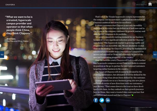It shows customers that Chayora is not only incredibly ambitious in its vision but can deliver on it both now and in the future as the company continues its growth journey and adds further campuses to its portfolio . “ We are at a massively exciting moment for our business because it ’ s a very significant inflection point for Chayora ,” says Jones . “ The hyperscale market is growing rapidly and it ’ s growing at an incredible rate . We are absolutely crystal clear on the strategy for Chayora , providing the fundamental infrastructure to enable major international companies to access and succeed in China and ultimately be part of the new and burgeoning prosperity of the country .”