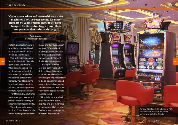 For Moreira , two key trends have emerged over recent years – instant sharing of experience and social media . “ People spend a large portion of their time on social media sharing their achievements and their successes ,” he says . “ It ’ s all about providing the opportunity to “ brag ” and operations like ours are looking at Social Media integration . This is part of what Moreira believes is a key differentiator from many competitors . He feels that technology is and will continue to be an enabler of added value out of existing gaming systems , which in turn adds value to the Tigre de Cristal resort overall .