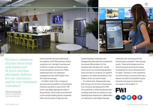 A further mark of the company ’ s success was its addition to Vista Equity Partners ’ portfolio in early 2019 . FWI is the only digital signage provider in the portfolio , which hosts more than 60 of the world ’ s leading SaaS companies . Vista only focuses on high-growth ,