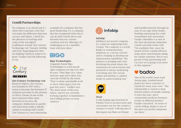 21st Century Technology Ltd Based in Nigeria , 21st Century was founded in 1997 with a vision to become the foremost IT solutions provider in the entirety of Africa . Owner of one of the most extensive fibre optic networks in its area , the company ’ s dedication to quality and innovation make it ideally suited to working with Centili . “ 21st Century is a very interesting example of a company that has great leadership . It ’ s a company that has recognised what else it can do with Centili above and beyond even our current roadmap and our offerings ; it ’ s challenging us on a monthly basis with new ideas .”