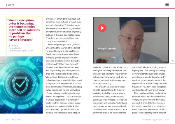 At the beginning of 2020 , Unisys announced the launch of the latest version of its award-winning Unisys Stealth security software suite . Stealth strives to give its clients order , resilience and breathing room in their cyber posture so that they have the confidence to handle whatever happens and so providing assurance , reassurance and resilience to the business . “ We achieve this by using software defined perimeters and identity-based encrypted microsegmentation to create a zero trust environment , providing hyper secure end-to-end encryption of data between any two points , anywhere ,” he explains . “ This is in addition to unique capabilities in cloaking networks ( so they become undetectable to attackers – ‘ you can ’ t attack what you can ’ t see ’), dynamic isolation , an industry first that can isolate a rogue