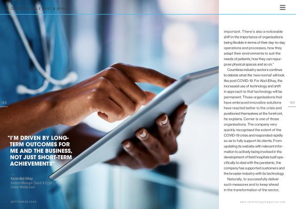Countless industry sectors continue to debate what the ‘ new normal ’ will look like post COVID-19 . For Abd-Elhay , the increased use of technology and shift in approach to that technology will be permanent . Those organisations that have embraced innovative solutions have reacted better to the crisis and positioned themselves at the forefront , he explains . Cerner is one of those organisations . The company very quickly recognised the extent of the COVID-19 crisis and responded rapidly so as to fully support its clients . From updating its website with relevant information to actively being involved in the development of field hospitals built specifically to deal with the pandemic , the company has supported customers and the broader industry with its technology .