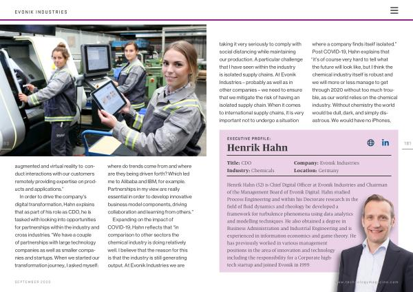 Henrik Hahn ( 52 ) is Chief Digital Officer at Evonik Industries and Chairman of the Management Board of Evonik Digital . Hahn studied Process Engineering and within his Doctorate research in the field of fluid dynamics and rheology he developed a framework for turbulence phenomena using data analytics and modelling techniques . He also obtained a degree in Business Administration and Industrial Engineering and is experienced in information economics and game theory . He has previously worked in various management positions in the area of innovation and technology including the responsibility for a Corporate hightech startup and joined Evonik in 1999 . www . technologymagazine . com