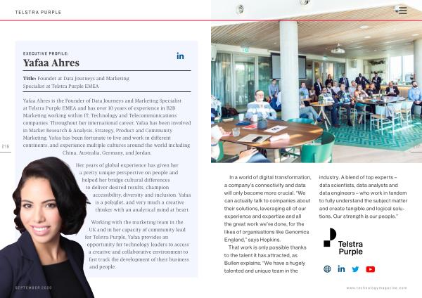 Yafaa Ahres is the Founder of Data Journeys and Marketing Specialist at Telstra Purple EMEA and has over 10 years of experience in B2B Marketing working within IT , Technology and Telecommunications companies . Throughout her international career , Yafaa has been involved in Market Research & Analysis , Strategy , Product and Community Marketing . Yafaa has been fortunate to live and work in different continents , and experience multiple cultures around the world including China , Australia , Germany , and Jordan .