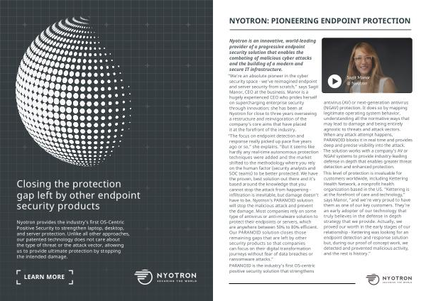Nyotron is an innovative , world-leading provider of a progressive endpoint security solution that enables the combating of malicious cyber attacks and the building of a modern and secure IT infrastructure . “ We ’ re an absolute pioneer in the cyber security space - we ’ ve reimagined endpoint and server security from scratch ,” says Sagit Manor , CEO at the business . Manor is a hugely experienced CEO who prides herself on supercharging enterprise security through innovation ; she has been at Nyotron for close to three years overseeing a restructure and reinvigoration of the company ’ s core aims that have placed it at the forefront of the industry . “ The focus on endpoint detection and response really picked up pace five years ago or so ,” she explains . “ But it seems like hardly any real-time autonomous protection techniques were added and the market shifted to the methodology where you rely on the human factor ( security analysts and SOC teams ) to be better protected . We have the proven , best solution out there and it ’ s based around the knowledge that you cannot stop the attack from happening - infiltration is inevitable , but damage doesn ’ t have to be . Nyotron ’ s PARANOID solution will stop the malicious attack and prevent the damage . Most companies rely on some type of antivirus or anti-malware solution to protect their endpoints or servers , which are anywhere between 50 % to 80 % efficient . Our PARANOID solution closes those remaining gaps that are left by other security products so that companies can focus on their digital transformation journeys without fear of data breaches or ransomware attacks .” PARANOID is the industry ’ s first OS-centric positive security solution that strengthens