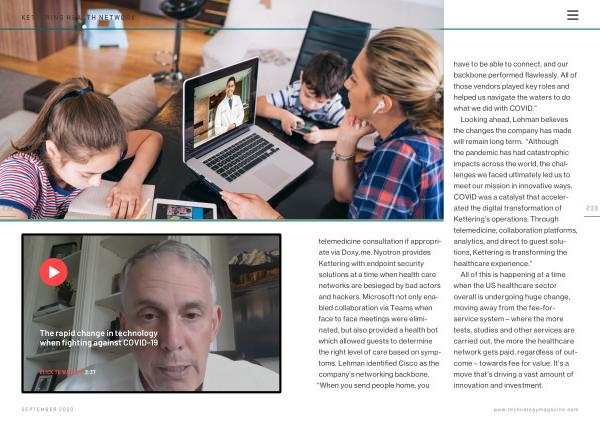 telemedicine consultation if appropriate via Doxy . me . Nyotron provides Kettering with endpoint security solutions at a time when health care networks are besieged by bad actors and hackers . Microsoft not only enabled collaboration via Teams when face to face meetings were eliminated , but also provided a health bot which allowed guests to determine the right level of care based on symptoms . Lehman identified Cisco as the company ’ s networking backbone . “ When you send people home , you have to be able to connect , and our backbone performed flawlessly . All of those vendors played key roles and helped us navigate the waters to do what we did with COVID .”