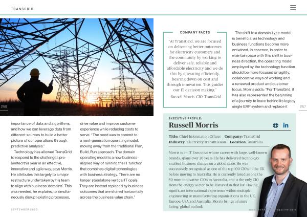 Technology has allowed TransGrid to respond to the challenges presented this year in an effective , innovative and agile way , says Morris . He attributes this largely to a major restructure undertaken by his team to align with business ‘ domains ’. This was needed , he explains , to simultaneously disrupt existing processes , drive value and improve customer experience while reducing costs to serve . “ The need was to commit to a next-generation operating model , moving away from the traditional Plan , Build , Run approach . The domain operating model is a new businessaligned way of running the IT function that combines digital technologies with business strategy . There are no longer standalone vertical IT goals . They are instead replaced by business outcomes that are shared horizontally across the business value chain .”