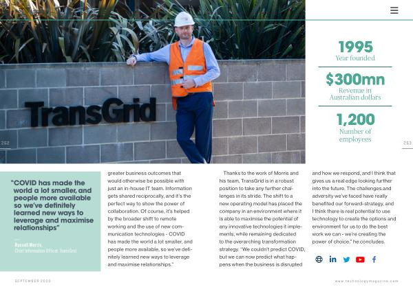 — Russell Morris , Chief Information Officer , TransGrid greater business outcomes that would otherwise be possible with just an in-house IT team . Information gets shared reciprocally , and it ’ s the perfect way to show the power of collaboration . Of course , it ’ s helped by the broader shift to remote working and the use of new communication technologies - COVID has made the world a lot smaller , and people more available , so we ’ ve definitely learned new ways to leverage and maximise relationships .”