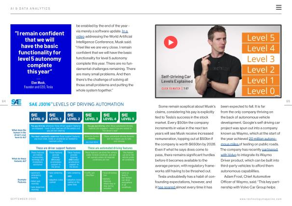 — Elon Musk , Founder and CEO , Tesla be enabled by the end of the year - via merely a software update . In a video addressing the World Artificial Intelligence Conference , Musk said : “ I feel like we are very close . I remain confident that we will have the basic functionality for level 5 autonomy complete this year . There are no fundamental challenges remaining . There are many small problems . And then there ’ s the challenge of solving all those small problems and putting the whole system together .”