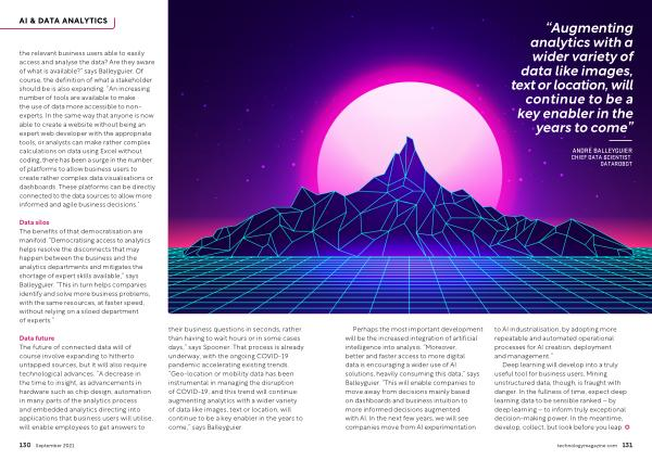 Perhaps the most important development will be the increased integration of artificial intelligence into analysis . “ Moreover , better and faster access to more digital data is encouraging a wider use of AI solutions , heavily consuming this data ,” says Balleyguier . “ This will enable companies to move away from decisions mainly based on dashboards and business intuition to more informed decisions augmented with AI . In the next few years , we will see companies move from AI experimentation to AI industrialisation , by adopting more repeatable and automated operational processes for AI creation , deployment and management .”