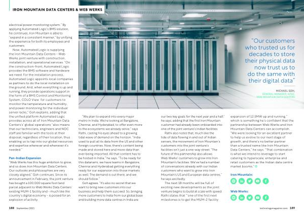 Pan-Indian Expansion “ Web Werks has this huge ambition to grow , and so does Iron Mountain Data Centers . Our outlooks and philosophies are very closely aligned ,” Goh continues . Since its announcement in February , the joint venture has bought a 100,000 square foot land parcel adjacent to Web Werks Data Centers ’ existing MUM-1 facility and - much like the country ’ s digital economy - is poised for an explosion of activity .