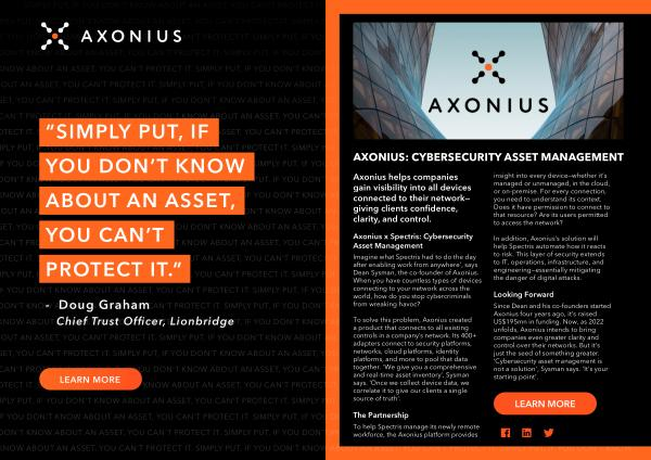 U CAN ' T PROTECT IT . SIMPLY PUT , IF YOU DON ' T KNOW ABOUT AN ASSET , YOU Axonius x Spectris : Cybersecurity In addition , Axonius ’ s solution will