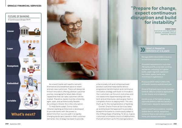 Overall , Oracle Financial Services takes an architectural-first approach to provide a blueprint for banks to continuously adapt to the shifting shape of banking . To do so , it gives customers a complete choice of deployment that will set them up for the next generation .
