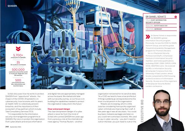 Dr Daniel Schatz is responsible for QIAGEN ’ s global Information Security program . Previously , he was the CISO for DAZN , Perform Group , and led the global Threat & Vulnerability Management program for Thomson Reuters . He is a Chartered Security Professional ( CSyP ), a Chartered Institute of Information Security member , and holds qualifications including CISSP , CISM , CIPP / E , CIPM , CCSK , ISO27001 LA / LI . He received his MSc in Information Security & Computer Forensics from the University of East London , where he also completed his PhD focusing on the Economics of Information Security . He was one of the organisers of the popular Security Bsides London conference . organisation renowned for its sensitive data . “ As a CISO we tend to have a low profile but if things suddenly go wrong we become the most crucial person in the organisation .