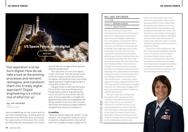 Maj . Gen . Kimberly A . Crider is the Mobilisation Assistant to the Chief of Space Operations , Headquarters United States Space Force , the Pentagon , Washington , D . C . In this position , she assists the CSO to organise , train , equip and maintain space forces by contributing to the development of strategy , long-range plans , and concept of operations , as well as the activities ensuring the service builds and employs effective space forces . In addition to her role as mobilisation assistant , Maj . Gen . Crider serves as the Acting USSF Chief Technology and Innovation Officer . In this role , she is charged with unlocking and harnessing innovation to leverage increased speed and advantage . She is responsible for developing strategy and policy to advance Science and Technology and Research , Development , Test , and Evaluation ; employing cutting edge technologies to digitally transform the USSF ; assuring USSF information technology needs are met ; effectively managing USSF data ; and conducting analysis supporting all USSF staff elements .