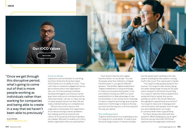 Focus on solving Experience and certification is one thing , but Pryor thinks the thing that makes iOCO stand out is its ability to solve . “ If we can ’ t help on a specific engagement we ’ ve got someone else in the organisation who can . So if we ’ re doing a software development gig for you and your server goes down and you ’ re running around the office panicking , I can say , it ’ s okay , let ’ s go to these people and we can help . We are really underpinned by our competencies .