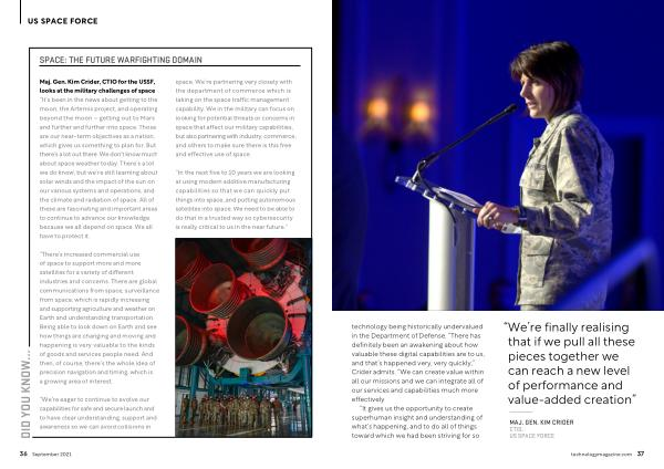 Maj . Gen . Kim Crider , CTIO for the USSF , looks at the military challenges of space “ It ’ s been in the news about getting to the moon , the Artemis project , and operating beyond the moon – getting out to Mars and further and further into space . Those are our near-term objectives as a nation , which gives us something to plan for . But there ’ s a lot out there . We don ’ t know much about space weather today . There ’ s a lot we do know , but we ’ re still learning about solar winds and the impact of the sun on our various systems and operations , and the climate and radiation of space . All of these are fascinating and important areas to continue to advance our knowledge because we all depend on space . We all have to protect it . space . We ’ re partnering very closely with the department of commerce which is taking on the space traffic management capability . We in the military can focus on looking for potential threats or concerns in space that affect our military capabilities , but also partnering with industry , commerce , and others to make sure there is this free and effective use of space .