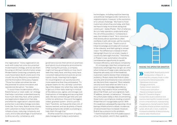 RUBRIK technologies , including machine learning and artificial intelligence ( AI ). Central to its implementation , however , is the resolution of a cultural challenge . “ We have to meet customers where they are today , and then we have to help move them along that continuum ,” states Phelan . “ Part of what we do is to help operators understand what the ‘ art of the possible is .’ Complexity is easy , but simple is hard .” He is conscious that anxiety about automation often conflates it with job losses , yet he counters that this isn ’ t the case . “ There ' s a lot of tribal knowledge and tradecraft involved in the industry , and that ’ s going to remain intact . The difference is instead of them taking eight hours to run a task , maybe it could only take eight minutes .” Therefore , in Phelan ’ s view , automation should be considered an opportunity to upskill , increase efficiency , and reduce complexity .